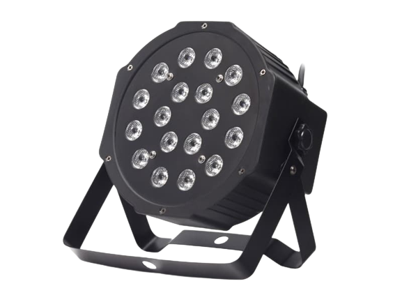 Deze rgb ledpar heeft 18 keer een LED van 1 Watt. Naast een 3-pins dmx aansluiting biedt dit armatuur een geluidsgestuurde optie en stand-alonefuncties van statische kleuren tot en met een automatische kleurenfade. Dit alles kan doorgelust worden via de master/slave optie. Door de vele functies en de dimbaarheid kan deze par niet alleen gebruikt worden om oppervlakken te belichten, maar ook als eye-candy naar het publiek toe.